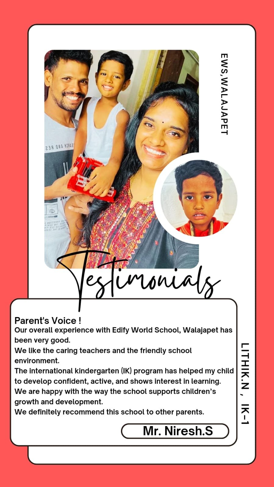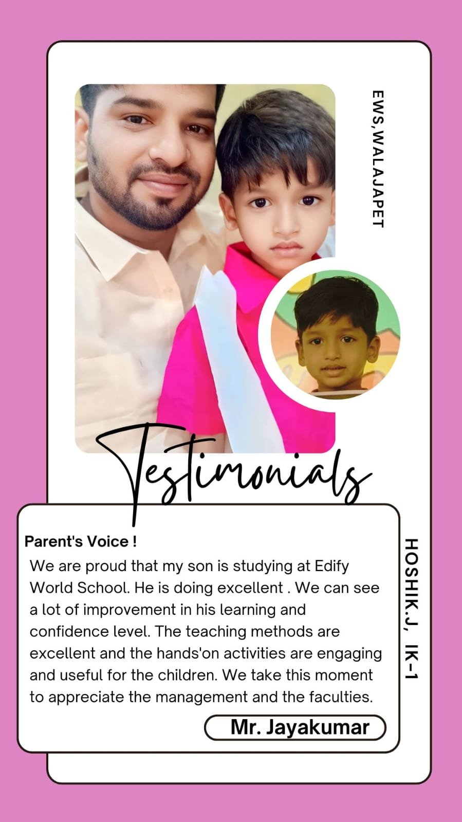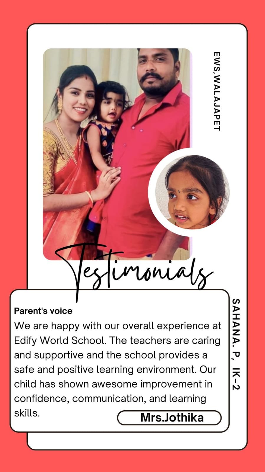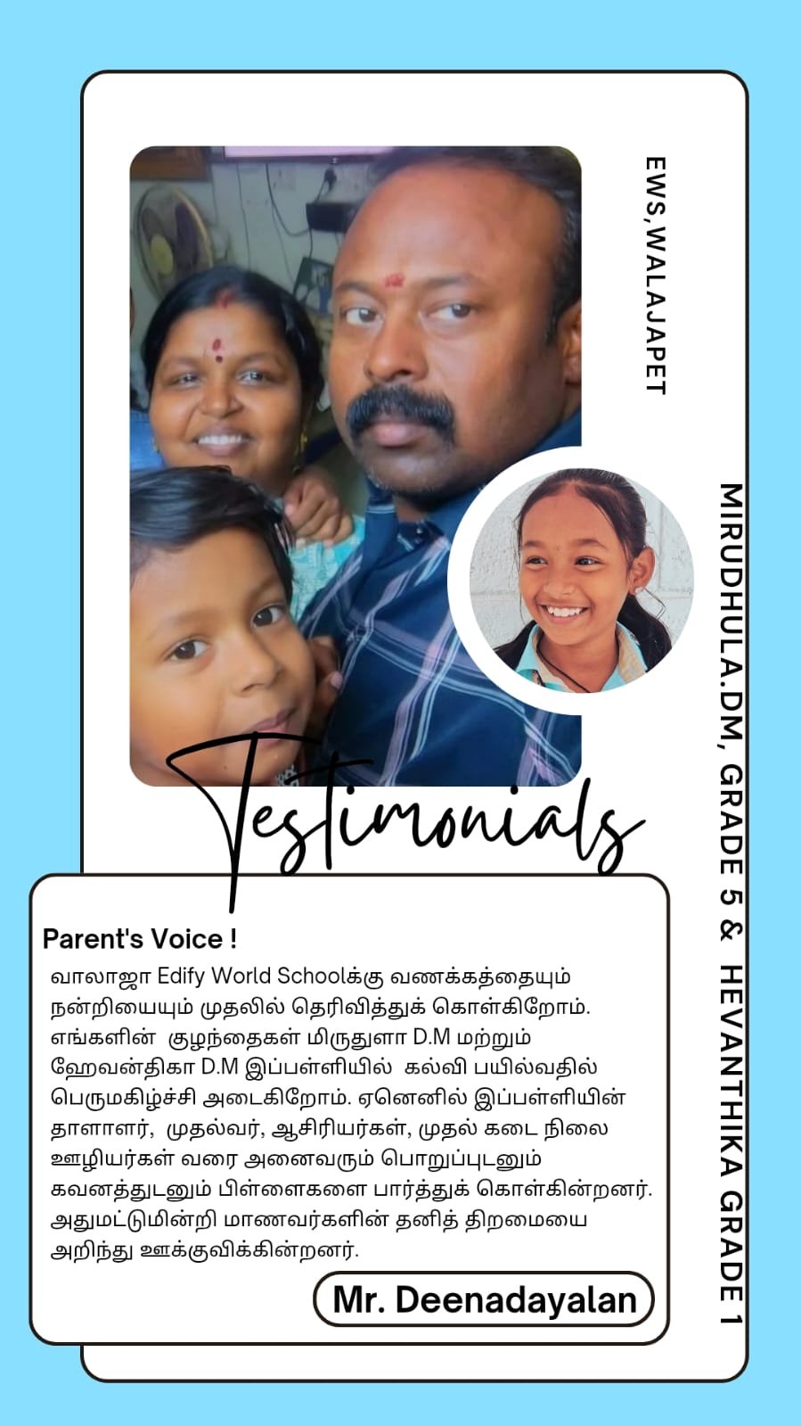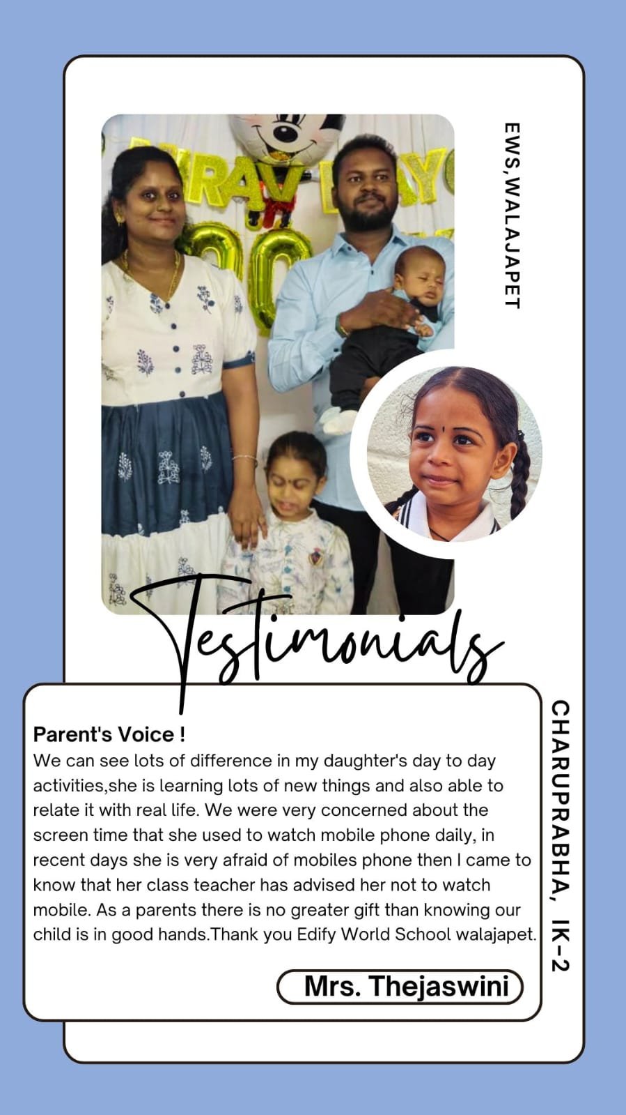 Edify World School Walajapet has classes from Kindergarten to Grade VII.